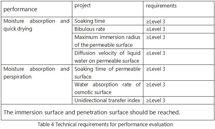 There are technical requirements for textile products in terms of water absorption rate, drip diffusion time, water evaporation rate and evaporation time, core absorption height and moisture permeability. According to Table 1 and Table 2, the hygmoscopic and quick drying performance of the product is evaluated. If all indicators of the product before and after washing meet the technical requirements, it can be clearly defined as the hygmoscopic and quick drying product.