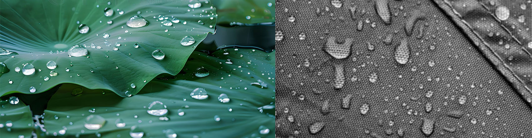 Waterproofing is correctly termed "water repellency." A common method involves adding a hydrophobic compound additive to a liquid tank at the entrance of the finishing machine. The fabric is then fed into the tank, padded, and dried, depositing the hydrophobic compound on the fiber surface. The hydrophobic compound modifies the surface tension of the fibers, limiting their reactivity and reducing the attraction of water molecules to the fibers (fiber surface tension is less than the cohesive force of water molecules). Water forms rolling droplets on the fabric surface (much like a lotus leaf pushing dewdrops). This is also known as "water repellency" or "waterproofing" (abbreviated W/R). See the figure below: