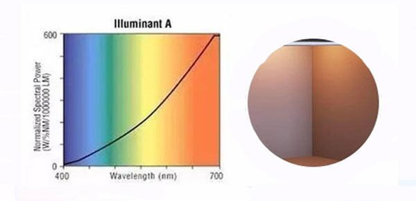 The A light source is a gas-filled spiral tungsten filament lamp with a color temperature of 2856K. It is a typical incandescent lamp primarily used for accent lighting in residential interiors or retail spaces.