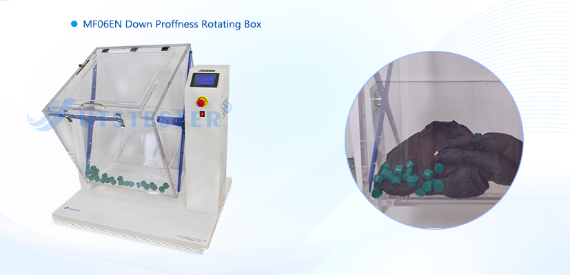 Principle: The entire test sample is placed in a rotating box of a testing instrument containing shaped silicone rubber balls. The rotating box rotates at a constant speed, bringing the shaped silicone rubber balls to a certain height and impacting the sample within the box, simulating the various squeezing, rubbing, and collision experiences experienced by the test sample during wear. The overall anti-down penetration performance of the garment is evaluated by calculating the number of down, feathers, and down fibers that emerge from the sample per unit area.